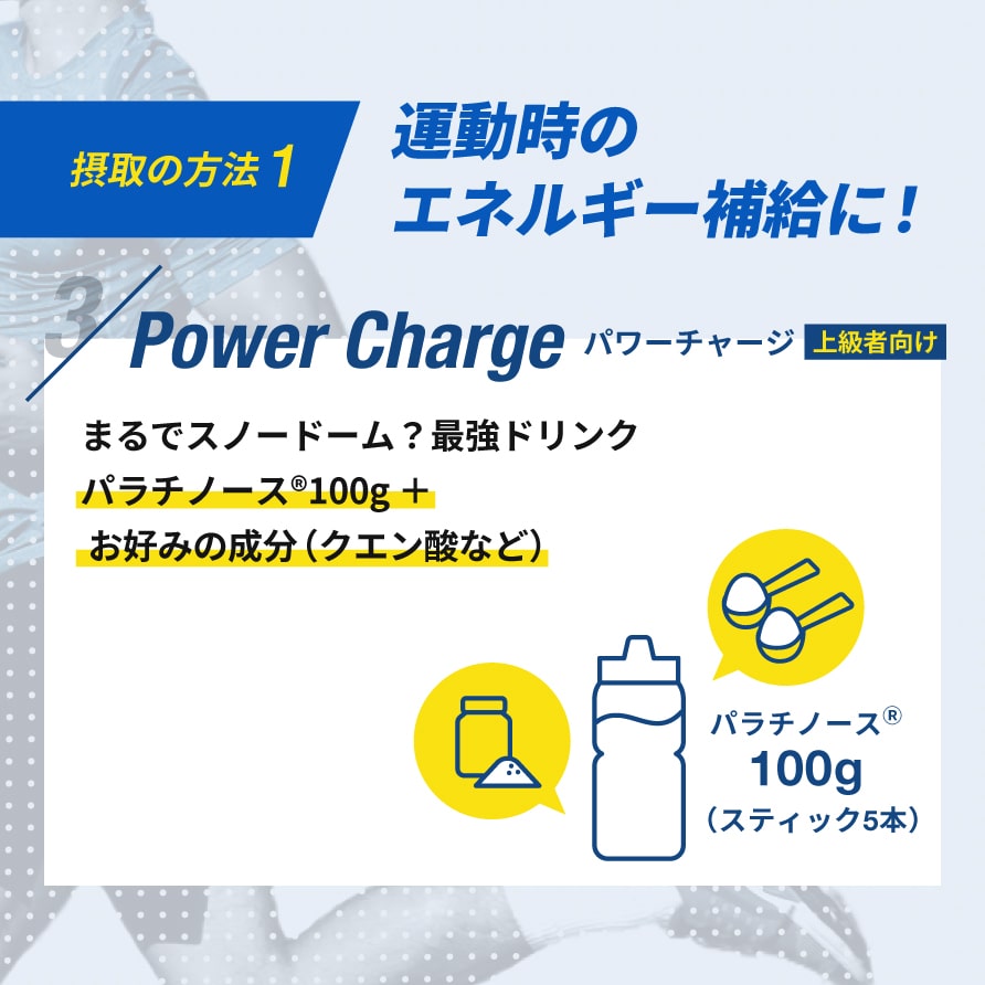 パラチノースは持続性のエネルギー源なので、瞬発力を必要とするスポーツよりも2時間以上となるような持久系のスポーツの栄養補給に適しています。