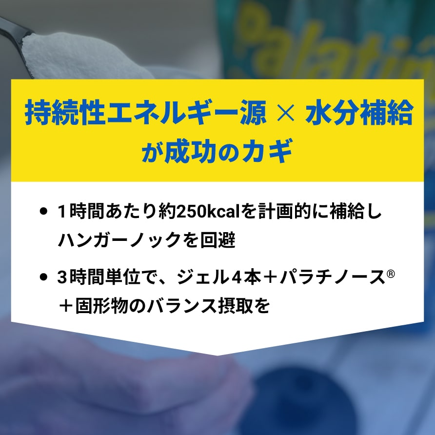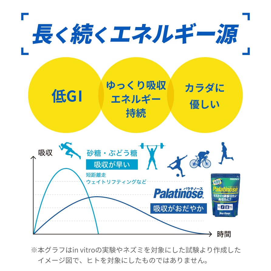 パラチノースは持続性のエネルギー源なので、瞬発力を必要とするスポーツよりも2時間以上となるような持久系のスポーツの栄養補給に適しています。