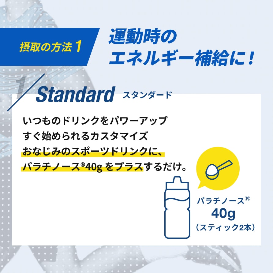 高純度パラチノースのスティックタイプです。小腸全体でゆっくり吸収されるので、 特にマラソンやトライアスロンなど持久系のスポーツなどに、おすすめの糖質です。