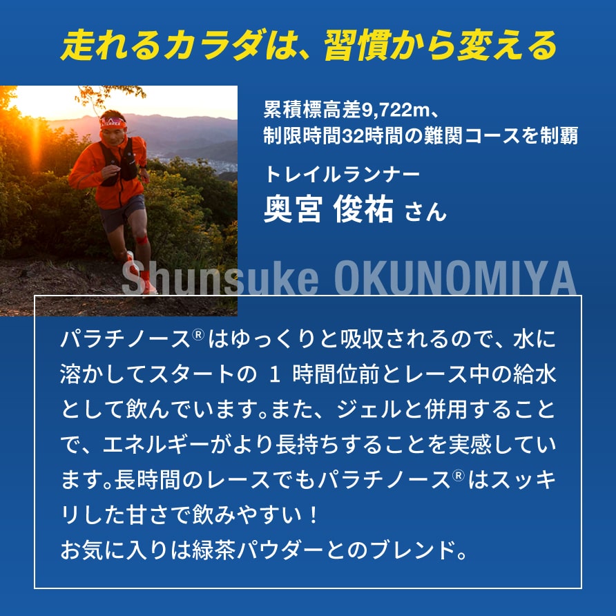 パラチノースを初めて使ったのは福岡国際マラソンに出場した時です。スペシャルドリンクにパラチノースを入れたところ、今まで使っていたジェルを摂らずにうまく走ることができました。ジェルはあまり得意な方ではなかったので、パラチノースは自分に合っているという実感がありました。