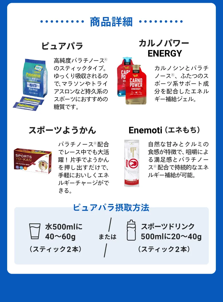 ピュアパラスティック 名称 パラチノース 栄養成分 エネルギー 380kcal たんぱく質 0g 脂質 0g 炭水化物 94.9g 糖質 94.9g 食物繊維 0g 食塩相当量 0g カルノパワーENERGY ラムネ味 原材料 果糖(アメリカ製造)、マルトデキストリン、パラチノース、食塩、L-カルノシン/クエン酸、クエン酸ナトリウム、香料 栄養成分[1本(40g)あたり] エネルギー 108kcal たんぱく質 0.08g 脂質 0g 炭水化物 26.92g 食塩相当量 0.37g カルノパワーENERGY ジンジャーエール味 原材料 果糖(アメリカ製造)、マルトデキストリン、パラチノース、食塩、L-カルノシン/クエン酸、クエン酸ナトリウム、カフェイン、香料 栄養成分[1本(40g)あたり] エネルギー 106kcal たんぱく質 0.09g 脂質 0g 炭水化物 26.35g 食塩相当量 0.37g スポーツようかんあずき 原材料 マルトデキストリン(国内製造)、生あん(小豆)、砂糖、パラチノース、寒天、食塩 栄養成分[1本40g当たり] エネルギー 113kcal たんぱく質 1.4g 脂質 0.1g 炭水化物 26.5g 食塩相当量 0.14g カリウム 9mg マグネシウム 6mg カルシウム 13mg ※賞味期限:製造後1年 Enemoti(エネもち)クルミ餅 原材料 水飴、砂糖、パラチノース、小麦粉、くるみ、もち粉、あん、醤油(大豆を含む)、オブラート(澱粉)/炭酸Ca 栄養成分[1本(40g)あたり] エネルギー 145kcal たんぱく質 1.6g 炭水化物 27g 脂質 3.4g 食塩相当量 0.1g