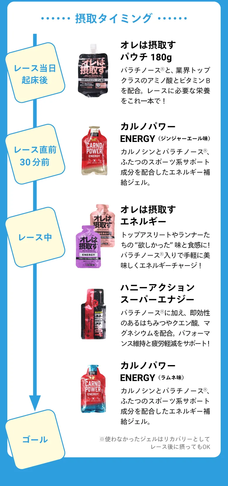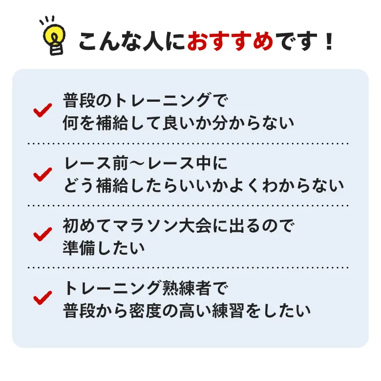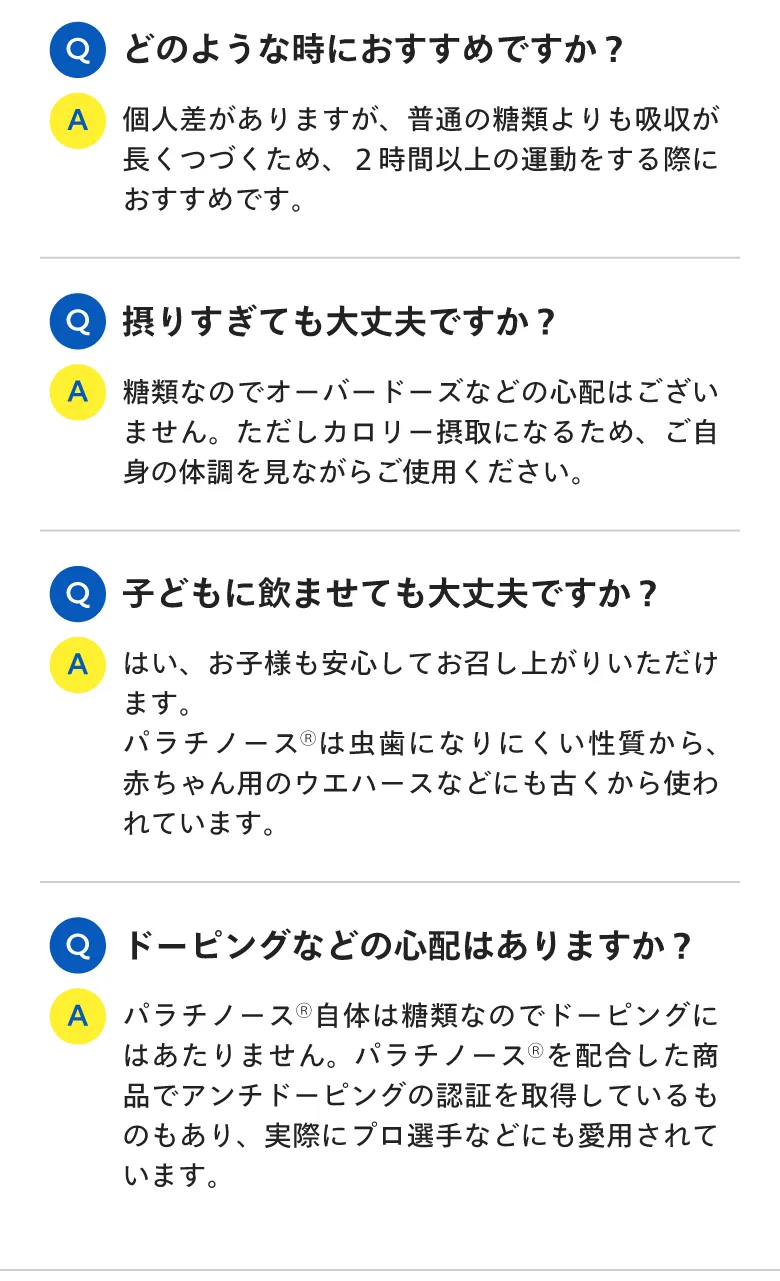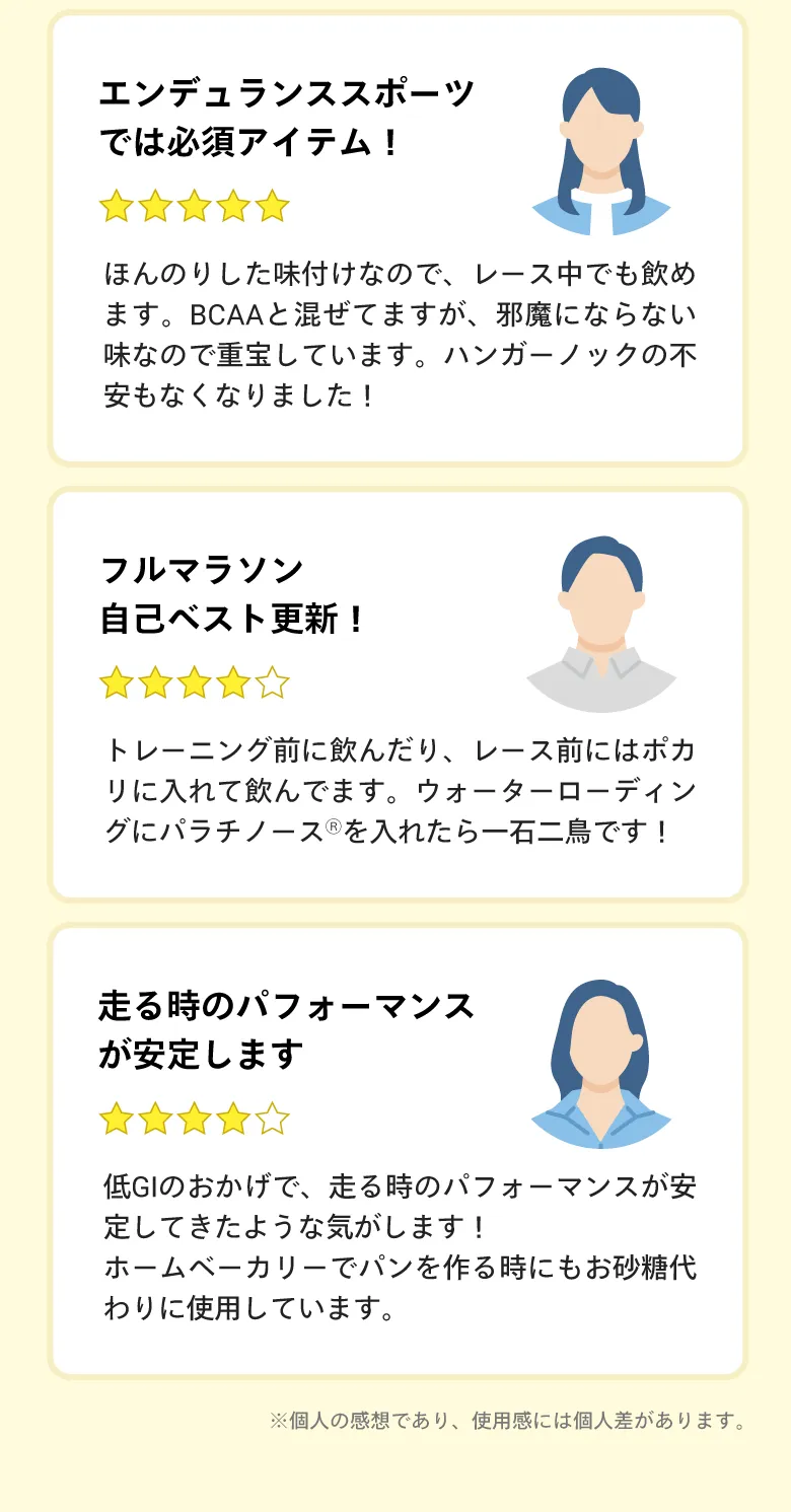 パラチノースは持続性のエネルギー源なので、瞬発力を必要とするスポーツよりも2時間以上となるような持久系のスポーツの栄養補給に適しています。