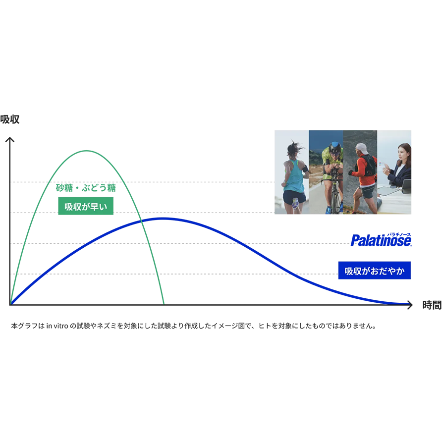 パラチノースは持続性のエネルギー源なので、瞬発力を必要とするスポーツよりも2時間以上となるような持久系のスポーツの栄養補給に適しています。
