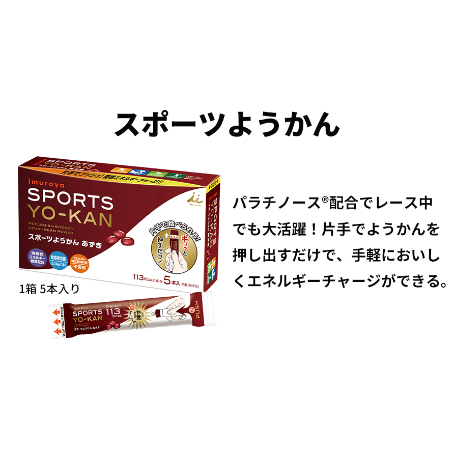 片手でようかんを押し出すだけで、手軽においしくエネルギーチャージができます。 持続性エネルギー糖質パラチノースを配合しているのでスポーツ・アウトドアに最適です。